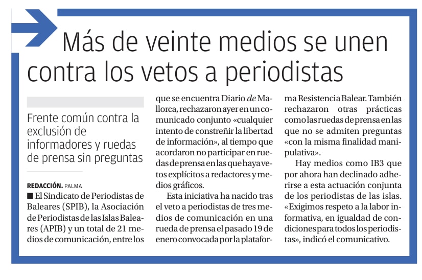 Como profesionales de la comunicación, en el SPIB somos conscientes de la importancia que tiene aparecer en los medios, no solo tras el visor de la cámara o bajo una firma. El hecho de que un medio de comunicación publique cualquier acción del sindicato, por mínimo que sea ese impacto, significa que aumentan las posibilidades de que conozcan lo que hacemos. Gracias a la repercusión de nuestras acciones a través de la prensa, el SPIB se conoce más y mejor. Y ese es uno de los objetivos del sindicato: que se familiaricen con lo que somos y que sepan que el SPIB está más vivo que nunca.